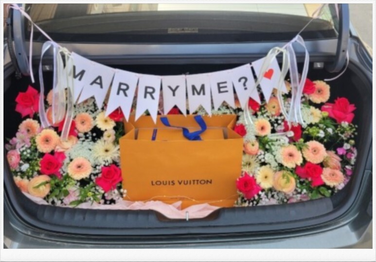 본인의 차 트렁크에서 꽃과 명품가방으로